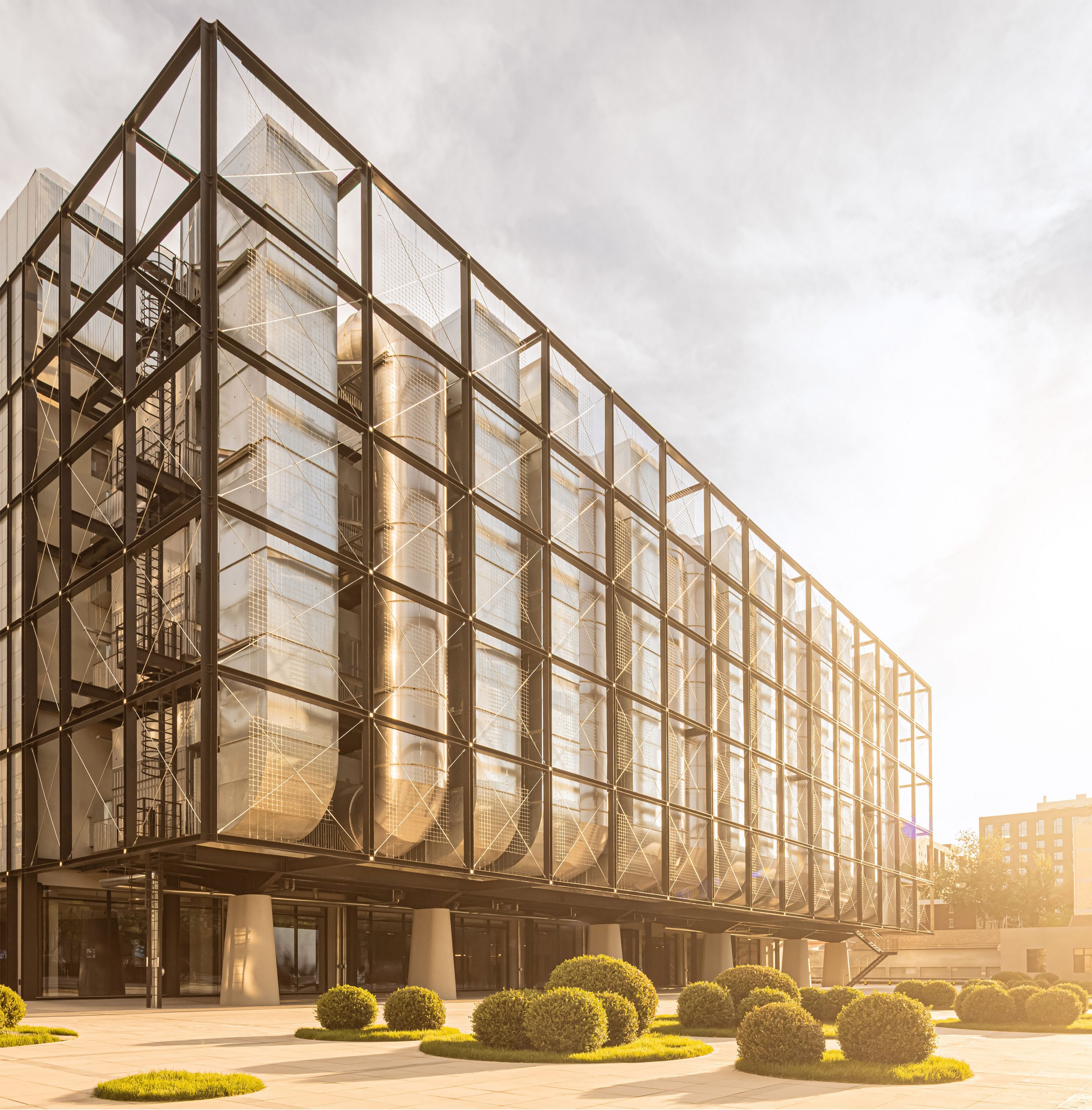 The building's facade, under natural light during the day, presents exposed functional hardware, highlighting the functional operation of biological mechanisms—the breathing and heartbeat—representing the ecological embodiment of the intelligent entity. Indirect evaporative cooling equipment connecting each floor to the internal computer room spaces extracts the recirculated air and channels it upward through ductwork to the roof height, thus forming a vertically running-through language of ductwork.